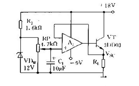 1-34所示,由穩(wěn)壓管VDw供給的12V基準(zhǔn)電壓通過(guò)電位器RP加到運(yùn)放A1的同相輸入端,穩(wěn)壓電源的輸出電壓Vsc又反應(yīng)到A1的反相輸入端,當(dāng)Vsc發(fā)生變化時(shí),它與同相輸入端電壓的差值被運(yùn)放放大,以操控調(diào)整晶體管VT的基極電流,改動(dòng)發(fā)射極與集電極間電壓降,從而使輸出電壓保持安穩(wěn)。此電路雖然簡(jiǎn)略,但客服了取樣電阻分壓比對(duì)安穩(wěn)性的影響,在不同的Vsc時(shí)有相同的反應(yīng)深度,且放大器的閉環(huán)增益為1,反應(yīng)最深,Vsc的安穩(wěn)性好。又由于Vsc就等于同相輸入端電壓,調(diào)理電位器RP就能夠使Vsc在0~12V范圍內(nèi)恣意改動(dòng)。